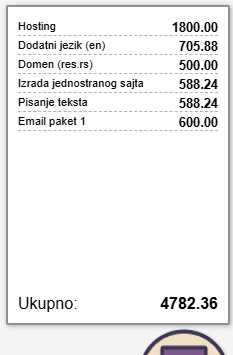 Tako što klijentu omogućavamo da izabere i plati samo ono što mu je zaista potrebno. Primer dole predstavlja cenu tzv. landing page sajta, na dva jezika (srpski i engleski) sa godišnjim hostingom i .res.rs domenom, 1gb mail sandučetom i pisanjem tekstova pomoću veštačke inteligencije.
